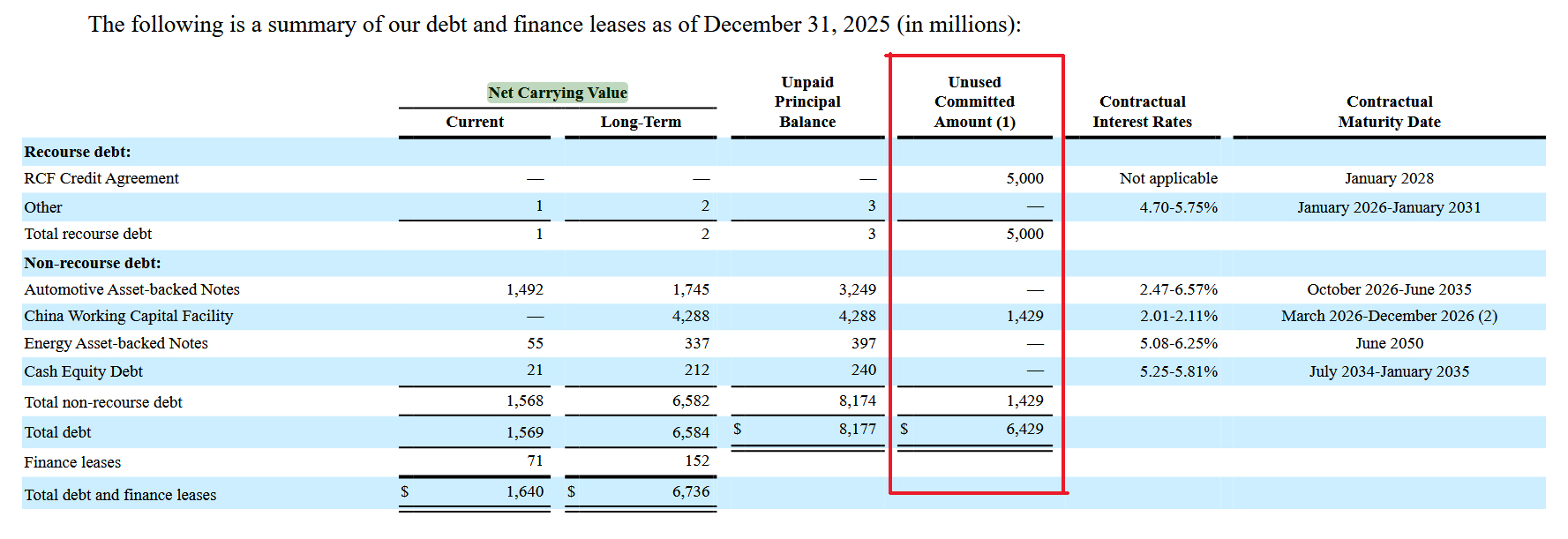 As of 4Q 2025, Tesla had up to $5.0 billion of available credits under the RCF Credit Agreement, as shown in the above snapshot. The good news is that Tesla has not made any drawdown on the available credits as of 4Q 2025.